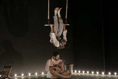 Partindo do jogo e da relação entre corpos e o espaço, o que se propõe é uma encenação focada no trabalho do ator. Em cena, os dois atores operam a iluminação e o som do espetáculo, construindo uma narrativa lúdica e imagética apoiada por elementos cênicos diversos como trapézio, ukulele e bongo.