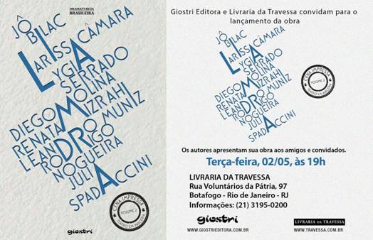 Seguindo o ditado que “um é pouco e dois é bom”, “Cena Impressa – Volume 2 – Teatro em parceria” repete a fórmula de autores novos com textos surpreendentes, trazendo como novidade o trabalho em parceria. O lançamento será dia 2 de maio, a partir das 19h, na Livraria da Travessa, em Botafogo (Rua Voluntários da Pátria, 97).