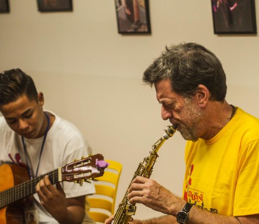 Sob o olhar atento dos 250 jovens atendidos pelo projeto Música Encantada, na Pavuna, Léo Gandelman dividiu suas experiências e falou sobre sua carreira. O músico também tocou junto com os jovens, que vivem em uma das áreas com o menor idh do Rio.