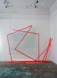 O primeiro, “Rabiscada”, utilizará cerca de dez placas – transparentes e leitosas – algumas suspensas e outras apoiadas no piso com cerca de 3,5m de altura e 10m de largura. Em meio às placas, uma linha geométrica formada por cerca de 20 varas finas, com 2m cada, na cor laranja percorrerá toda a extensão do trabalho desenhando por vezes à frente, por trás e também suspensas ou apoiadas na parede.