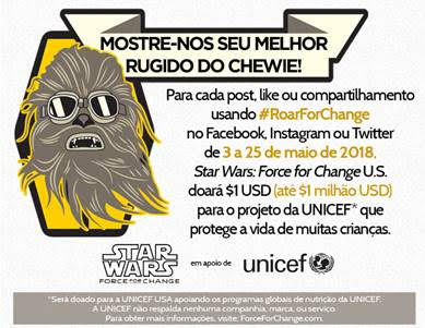 Lucasfilm e Star Wars: Force for Change anunciam hoje a campanha #RoarForChange, um desafio global para apoiar o UNICEF. A iniciativa convida fãs e suas famílias a compartilharem suas próprias versões do icônico rugido de Chewbacca. Para cada post público, curtida ou compartilhamento no Facebook, Instagram ou Twitter com a #RoarForChange, entre 3 e 25 de maio de 2018, a Star Wars: Force for Change EUA doará US$1 ao UNICEF EUA até atingir US$ 1 milhão. Os fundos serão utilizados para apoiar o trabalho de apoio do UNICEF em todo o mundo.