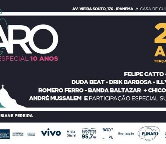 No próximo dia 28 de agosto (terça-feira), o programa de rádio FARO vai promover uma noite especial pra celebrar sua primeira década no dial carioca. Dez artistas acompanhados da banda Baltazar – formada pelos músicos Eric Camargo e Pedro Tentilhão – vão se apresentar na Casa de Cultura Laura Alvim.