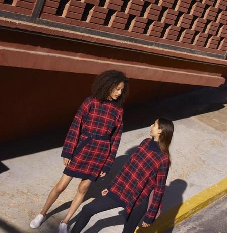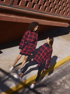 A ousadia do tartan num vestido de jacquard de lã com cinto, um suéter amplo de gola rolê ou uma jaqueta de lona de algodão com zíper que contrapõe a sobriedade de uma blusa de gola alta com riscas de giz contrastantes ou um casaco longo de lã mesclada.