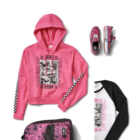 Celebrando o DIY (do-it-yourself, faça você mesmo) e a liberdade de escolha seguimos com a Lady Vans Sting LS Raglan DIY Shirt, com um gráfico oversized e um diagrama de “corte aqui” estampado no forro, instruindo como customizar a camiseta e a transformar em um crop top ou uma manga curta – ou as duas coisas ao mesmo tempo. Desenhado para parecer com o clássico visual de camiseta-por-cima-do-moletom dos anos 1990 o moletom com capuz Lady Vans Sting Pullover em azaela pink compartilha o gráfico principal com uma manga longa de mesmo nome, junto com detalhes em Checkerboard e muita atitude. Também abraçando o espírito DIY da coleção temos o vestido Zine Sting Dress, em algodão, spandex e jerséi estampado com imagens do zine, além das instruções internas para encorajar a customização.
