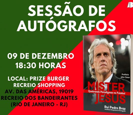 O Prize Burger do Recreio Shopping vai ser palco do lançamento do livro “Mister Jesus: Quebrando Paradigmas no Futebol”, do jornalista português Rui Pedro Braz, que estará no local para realizar uma sessão de autógrafos. O evento acontecerá no dia 9, às 18h30.
