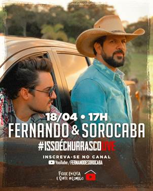 Depois de inúmeros pedidos, Fernando e Sorocaba anunciaram a data sua Live para o dia 18 de abril, sábado, às 17h. Batizada de “Isso é Churrasco Live”, em menção ao mais recente projeto da dupla, a transmissão acontecerá no canal oficial do Fernando e Sorocaba no Youtube, e promete durar, pelo menos, três horas.