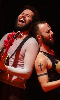“As canções são altamente teatrais e a companhia já tem uma ligação muito forte, uma identidade. O desafio foi potencializar este encontro e integrar os instrumentos ao que acontece em cena. Brincamos ao falar que eles ‘vestem’ os instrumentos. Não é simplesmente pegar o instrumento e tocar, não é um show. A ideia é que tudo aconteça de forma natural, integrada à cena”, explica Duda, que ressalta o intenso trabalho corporal (“não se deve confundir com força ou vigor”) do grupo.