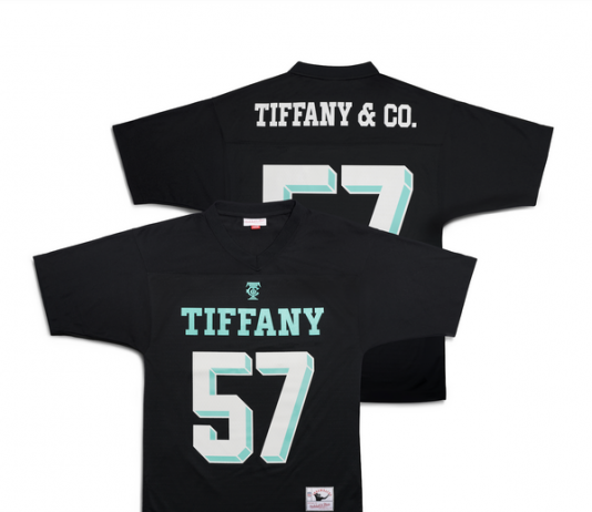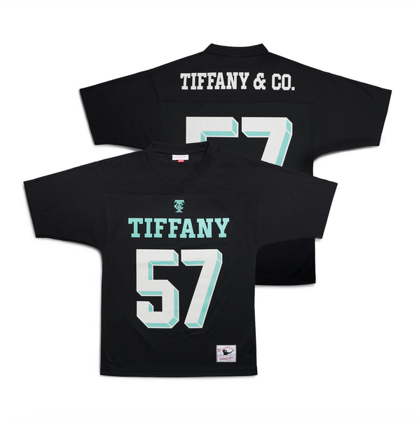 A camisa de futebol Tiffany x NFL x Mitchell & Ness ficou disponível em Tiffany.com a partir de quarta-feira, 1º de fevereiro.