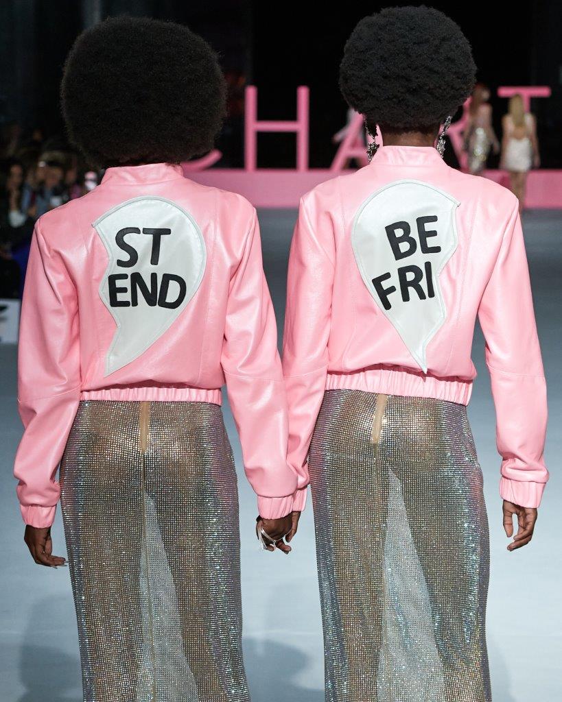 Em um mood glam, seguindo o conceito de memórias, os destaques ficam por conta das peças inovadas como a dupla de bomber jackets bicolores em couro, com a representação de colares em corações divididos por “best friends” na parte traseira da peça; e vestidos curtos que trazem laços maxi como cintos, além de uma longa cauda anexada.