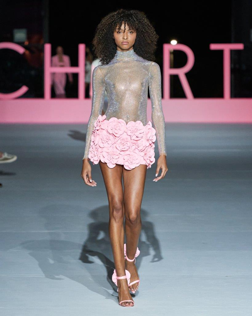 Em efeito 3D, vestidos e tops feitos manualmente em moulage trazem flores e corações estruturadas; com aplicações ou tecidos lisos, minissaias e o comprimento midi caminham entre o glamour e a sofisticação; a transparência e tule com hotfix em vestidos e saias levam à passarela um toque elegante e ousado; além de calças cargo e blazers cropped fashionistas e descolados.