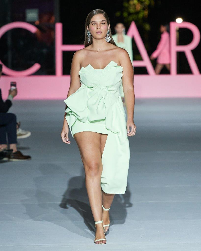Em diferentes destaques, o couro e o crepe de acetato aparecem em uma cartela de cores pensada exatamente para as tendências retratadas no desfile: o rosa bubble, que remete gomas de mascar em fitas, o verde Lima e o branco Vanilla. Nesta paleta, laços e flores maximalistas, tule com aplicação de hotfix, volume, capas oversized e bordados minuciosos protagonizam as peças desfiladas.