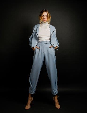 Apresentando 14 peças, a linha traz a elegância em modelagens elaboradas e detalhamento às peças. O mood sofisticado, referência da marca, edita os conjuntos em alfaiataria de calça com barrado ampliável e casaqueto com aviamento aplicado, disponíveis nas cores azul bebê, areia e preto. A camisa branca em viscose de algodão recebe mais de 100 ilhós pontilhados à peça, além de mangas bufantes.