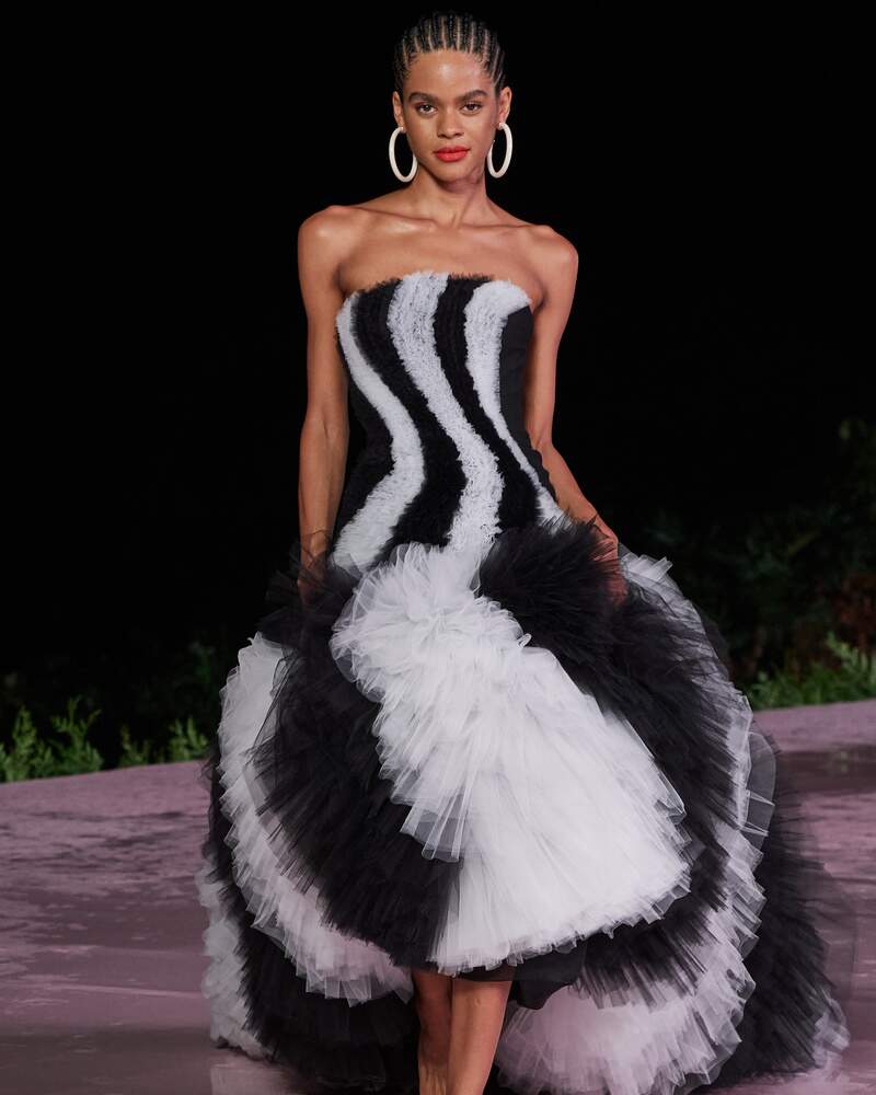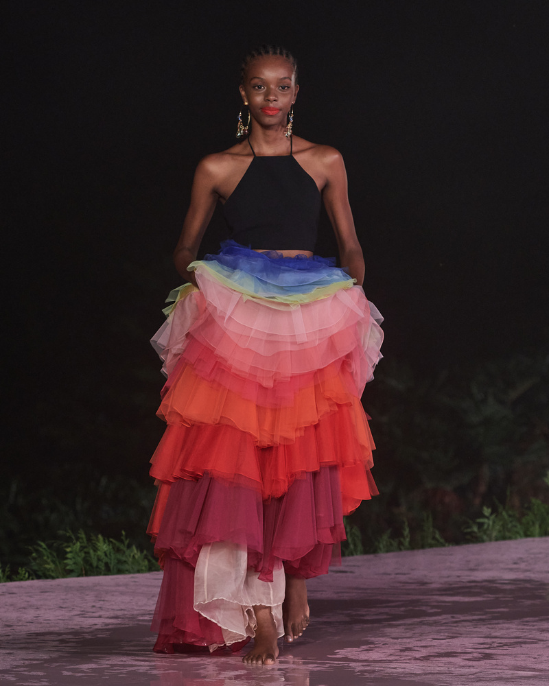 Aliás, as orquídeas são um motivo encontrado em toda a coleção, desde bordados delicados até estampas suaves de aquarela em organza. Um duo de peças em tule é um triunfo do ateliê de Nova York, feito a partir de centenas de camadas de tule recortado à mão, em ondas ondulantes de preto e branco, prestando homenagem ao calçadão modernista projetado pelo arquiteto paisagista brasileiro Roberto Burle Marx. A coleção é acentuada por joias vibrantes em tons de explosão estelar, cintilando sob o sol do crepúsculo.