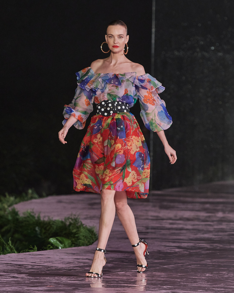 em tons de arco-íris ancorada no preto característico de Nova York. As proporções da clássica camisa de algodão são consideravelmente ampliadas, envoltas e presas em saias que alcançam o chão, cortadas em um drapeado tipo sarongue. As bolinhas assumem um tom brincalhão, em peças como camisas de seda inspiradas no guarda-roupa masculino e calças usadas com um top de biquíni combinando. O algodão vazado é mostrado em verde vibrante, vermelho laqueado e preto, cortado em vestidos de coquetel dramáticos, saias e vestidos que dão uma sensação de facilidade a peças separadas, elevadas e glamorosas.