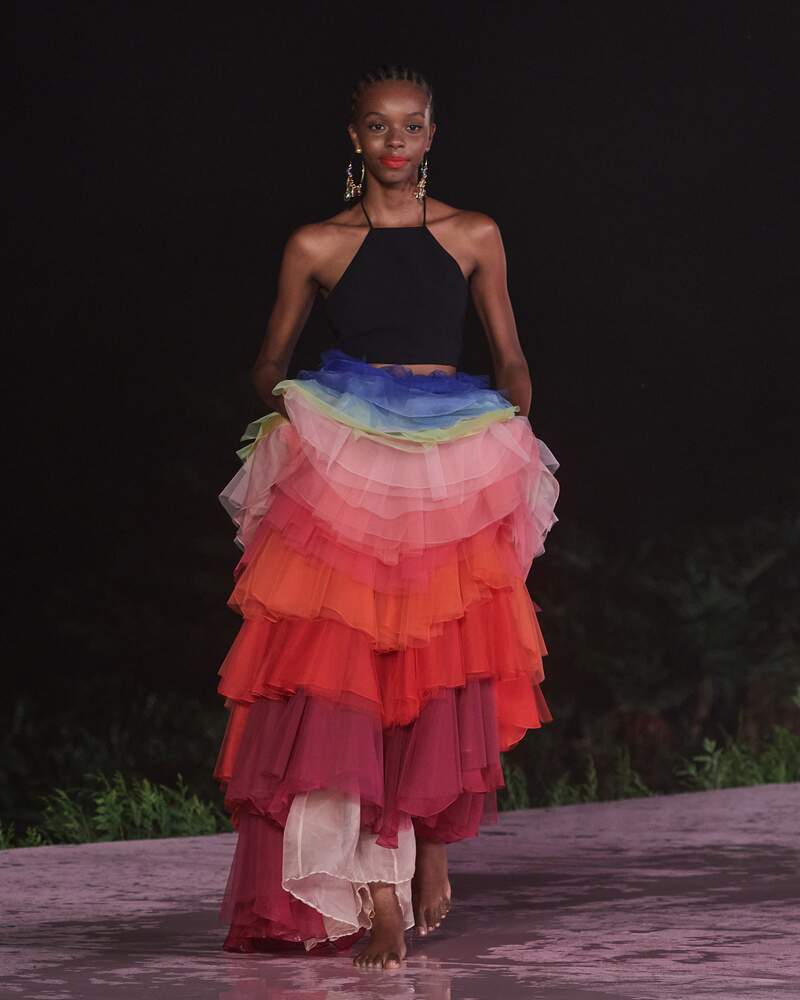 Blocos de cores inesperados criam entradas inesquecíveis, como um minivestido recortado em azul-lagoa, verde kiwi e laranja mamão. Uma saia com babados coloridos flutua, deliciando-se com a paleta de cores completa da coleção. Lantejoulas por toda parte adquirem um toque dramático, evocando flores em aquarela ou um pôr do sol cintilante.