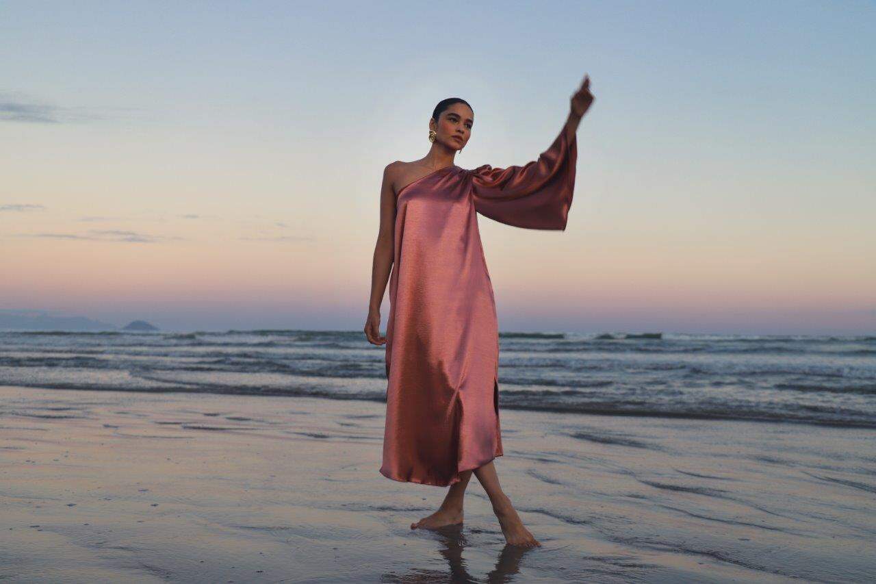 Uma segunda estampa surge em base de georgette leve e fluida, em peças com camadas, babados, assimetrias e muita bossa. A estampa foi criada a partir de uma série de aquarelas inspiradas em tons vibrantes da vida marinha em corais, vistas por Fernanda durante um mergulho de snorkel. Já em busca de uma variante mais neutra, os tons da estampa seguem tons de marrom, bege e preto.
