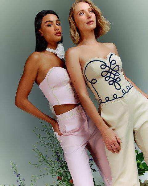 Top croppeds, calças, saias, camisas, shorts, macacões e vestidos dão forma a coleção e traduzem a estação por meio de modelagens amplas, que promovem a fluidez necessária para a primavera. Dentre os tecidos premium, a grife selecionou materiais naturais, como laise, linho, alfaiataria e tricoline, para incorporar frescor e conforto às peças. Outro tecido especial trazido foi o “espelho”, que tem origem indiana e conta com pequenos espelhos que ao contato com a luz, brilham intensamente, e dão vida a um conjunto de blusa com amarração e saia em camadas.