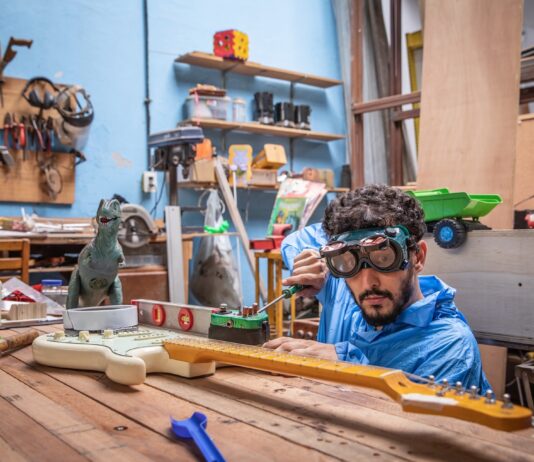 Acostumado a trabalhar com companhias teatrais, Gui já cultivava há tempos a vontade de montar um solo que reunisse música e dramaturgia. Para escrever “A máquina do tempo”, ele se inspirou na própria infância e na paternidade. “Sou filho único. Minha memória da infância tem muito de brincar sozinho e acompanhar as viagens de trabalho dos meus pais. Desenhava muito, criava mundos e histórias na minha cabeça”, recorda. Hoje pai de três filhos com idades entre 2 e 6 anos e agora com um bebê a caminho, Gui se vê rodeado pelo universo da criança. “A minha primeira plateia foram os meus filhos, e foi um sucesso em casa”, diz.