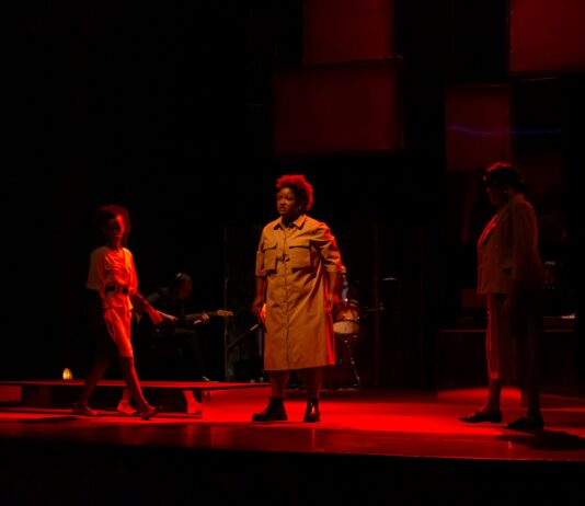 Dionisíaco em seu trânsito pelos rostos e pelos corpos dessas três atrizes, o design de luz proposto por Pedro Henrique e Diego sublinha catarses na representação das perdas. Dos perigos também, e são muitos. As personagens vividas pelo trio de protagonistas, numa fricção entre o ontem (a ditadura militar de 1964 a 1985) e o hoje (nas brutalidades policiais contra as populações periféricas), enfrentam uma série de percalços numa luta de afirmação que resvala, todo o tempo, pela vivência da maternidade.