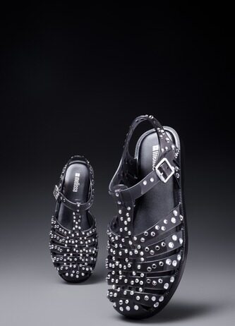 Cuidadosamente aplicados na parte externa do calçado, os cristais são acompanhados de extremo conforto pelo fechamento em fivela ajustável, palmilha com logo Melissa e as sandálias estão disponíveis nas cores branco transparente e preto fumê.
