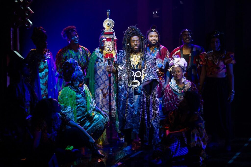 Idealizado por Jô Santana, esculpido dramaturgicamente pela filósofa Helena Theodoro e alinhavado como expressão estética por Falabella, “Martinho, Coração de Rei – O Musical” começa com um introito sob a ancestralidade das populações de origem africana, em evocação dos griôs, os contadores de histórias. Alan abre os trabalhos (e, qual frisa a gíria, “chega chegando”) como um guardião da oralidade que torna perene os mitos fundadores da cultura da qual Martinho é porta-voz. A exuberante cenografia de Zezinho Santos e Turíbio Santos, somada aos figurinos dionisíacos de Cláudio Tovar, faz lembrar a Wakanda de Pantera Negra (2018) ou a Zamunda de Um Príncipe Em Nova York (1988) com pompa quase hollywoodiana. Como Falabella tem um pé em “West Side Story” e outro em Ken Russell (diretor de “Tommy” e “Os Demônios”), o que existe de Hollywood nele logo ganha uma brasilidade marota, no padrão Cajado Filho (artesão autoral das chanchadas, realizador de “E O Espetáculo Continua”, de 1958) e, sem largar de mão a austeridade mítica, abre-se para um Carnaval.