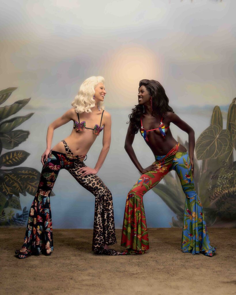 Elementos de destaque, como papagaios, cogumelos e borboletas, fazem parte de tops em paetê. Os biquínis vêm na proposta de sobreposição com calças transparentes de renda ou como parte de conjuntos, cheios de acessórios. Uma das apostas é a produção de borboletas com um top de mangas longas de babados maximalistas.