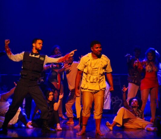 A direção de Charles Alves propõe um diálogo entre o realismo e o teatro épico: o palco se estende até a plateia,rompendo as paredes da ficção e convidando o público a fazer parte da narrativa. A dramaturgia, assinada por CharlesAlves, Flávia Freitas e Gabriel Engel, mergulha em temas como intolerância religiosa, reintegração de ex-detentos, prostituição, corrupção e violência de Estado, conduzindo o público entre crítica e catarse. Na direção de produção, Pietra Aranda articula o trabalho de mais de 20 artistas em cena e conduz um processo coletivo que une técnica e propósito. Henrie Araújo, na assistência de direção, contribui para a construção visual e sensorial da montagem, também responsável pela cenografia do espetáculo.