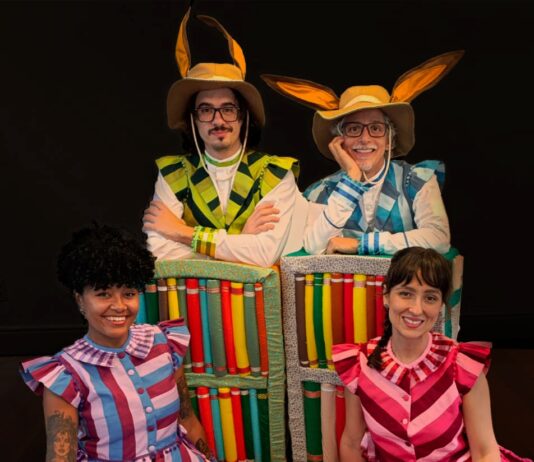 Em cena, os atores Adassa Martins, Gabriel Sant´Anna, Jess Araujo e Thiago Franzé se revezam com adereços e bonecos para contar a história das bibliotecas através dos personagens José Mindlin, um colecionador de livros raros, e um monge copista da idade Média.  E aos poucos eles vão conquistando o público e apresentando o universo literário.