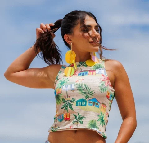Os tecidos priorizados são leves, fluidos e com elasticidade, adequados ao calor e ao uso prolongado. Além disso, a coleção conta ainda com desenvolvimento exclusivo de estampas no Conjunto Latina, com duas artes autorais da marca: uma de caju, em referência à tropicalidade, e outra de casinhas, inspirada na arquitetura típica de diferentes regiões da América Latina.