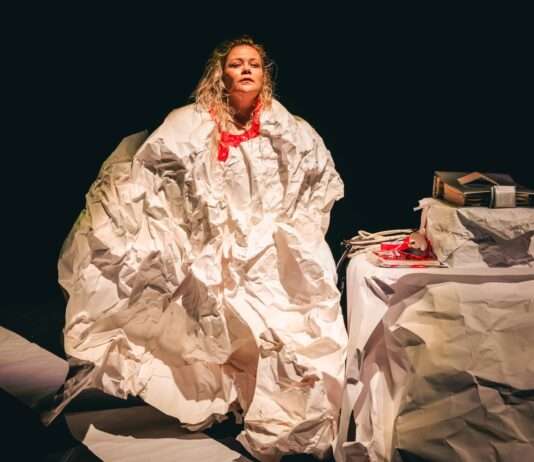 Para Natasha, a parte mais importante de “1 peça cansada” é a intimidade e a cumplicidade desenvolvida com os espectadores. Por isso, existe um esforço de eliminar as hierarquias convencionais do espaço cênico, e proposta de outras maneiras de se assistir a uma obra. Outra característica marcante na montagem é o papel. A performer aparece envolta neles e, em cima de uma mesa, estão outros tantos que também estão cansados, como fotos, trabalhos de escola e até a Constituição, “a brasileira mais cansada”, como costuma dizer a atriz.